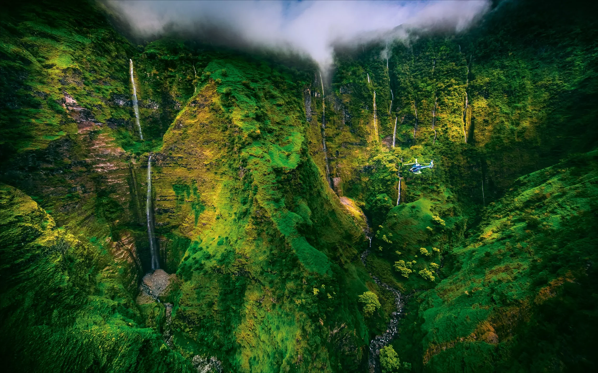 A helicopter reveals parts of Maui unreachable by car or foot—hidden waterfalls, razor-backed ridgelines, and deep rainforest valleys carved over millennia.